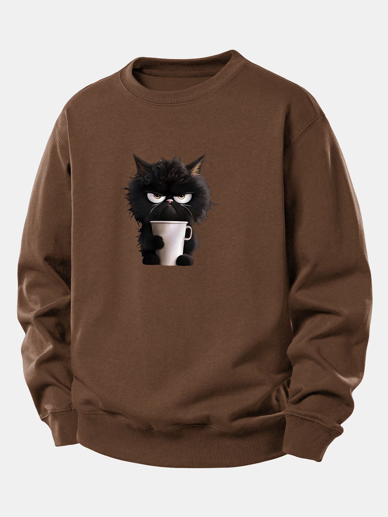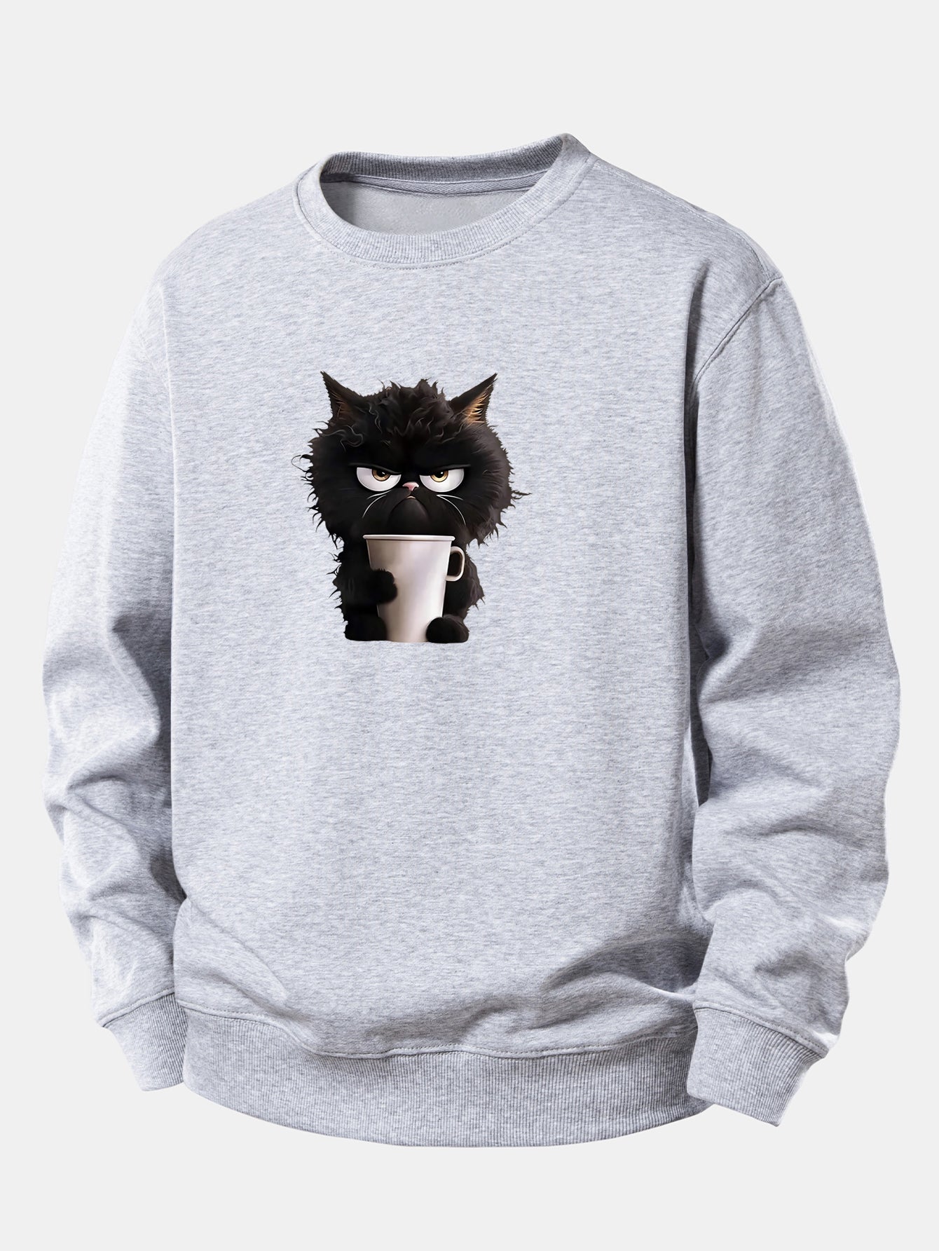 Black Cat Drinking Coffee Print Relax Fit Sweatshirt
