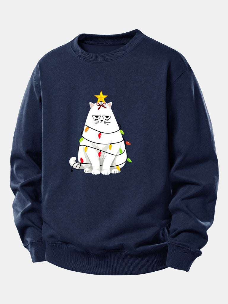 Christmas Lights White Cat Print Relax Fit Sweatshirt