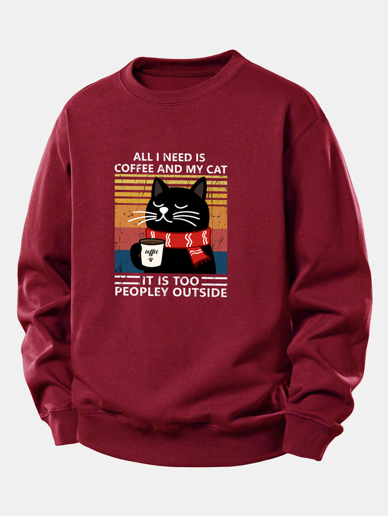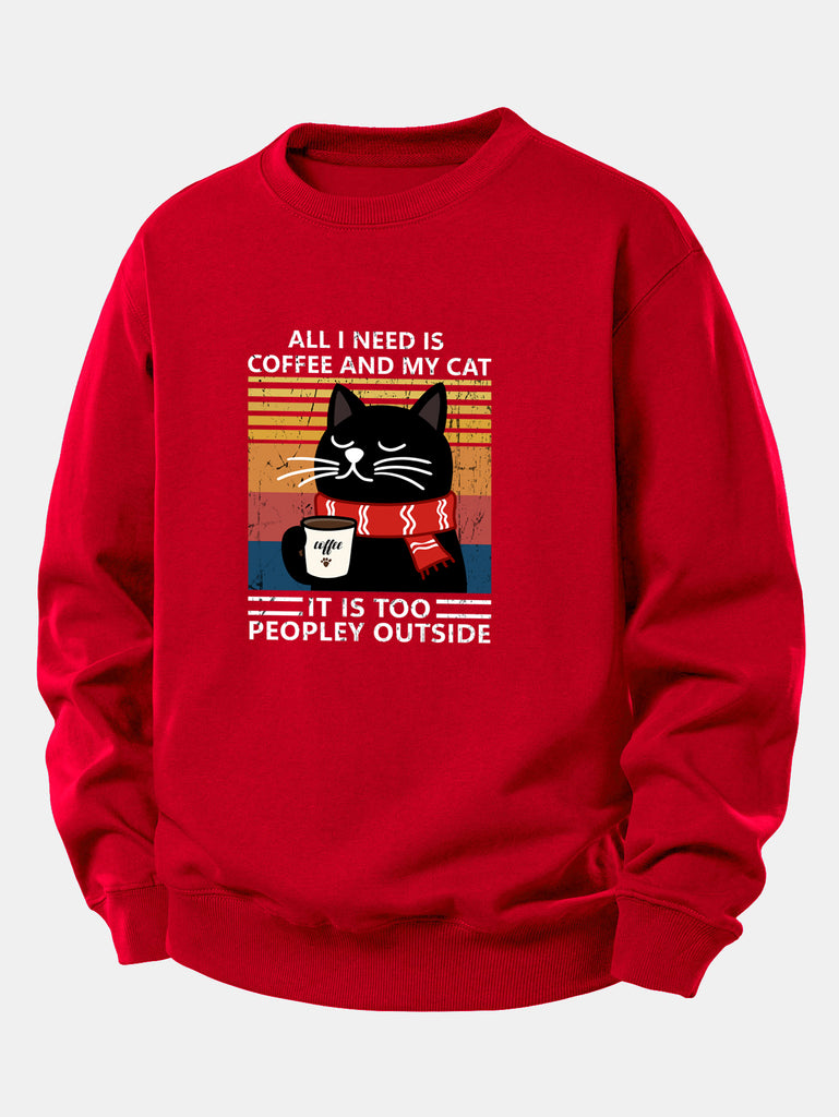 Black Cat Drinking Coffee Print Relax Fit Sweatshirt
